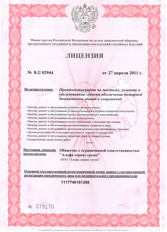 Компания «Альфа сервис групп» выполняет комплекс услуг по обеспечению пожарной безопасности зданий и сооружений. Мы предлагаем провести работы от проектирования систем безопасности до монтажа и пуско-наладочных работ. На стадии проектирования мы учитываем пожелания Заказчика по оборудованию, что позволяет выбрать наиболее подходящий и экономически целесообразный способ защиты объекта. Монтаж систем проводят бригады высококвалифицированных специалистов в короткие сроки, с соблюдением норм охраны труда, действующих норм и правил пожарной безопасности и строительных норм и правил.